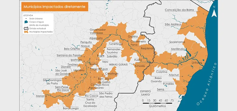 In an emergency action, part of the tailings was dammed in the Barragem de Candonga (Candonga Dam), in the municipality of Rio Doce (MG). However, about 18.9 million m³ of this material went on for 537 kilometers until the mouth of the Rio Doce with the Atlantic Ocean, in Linhares county (ES).