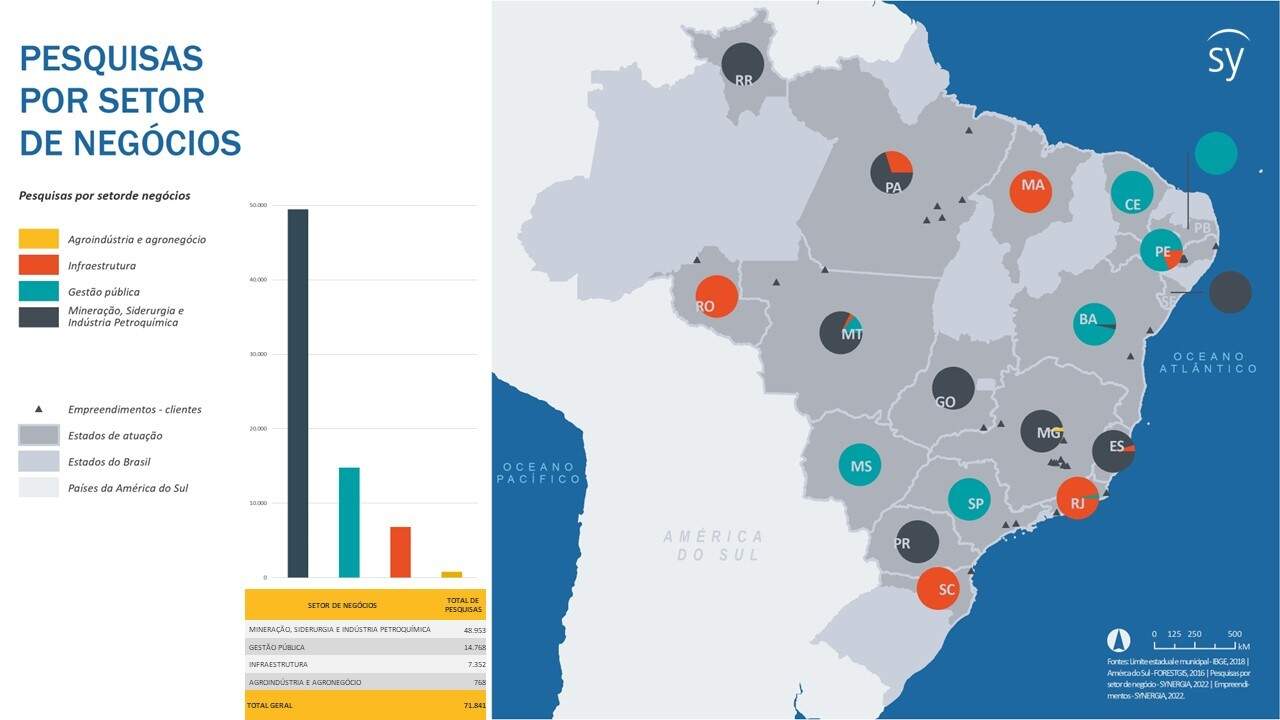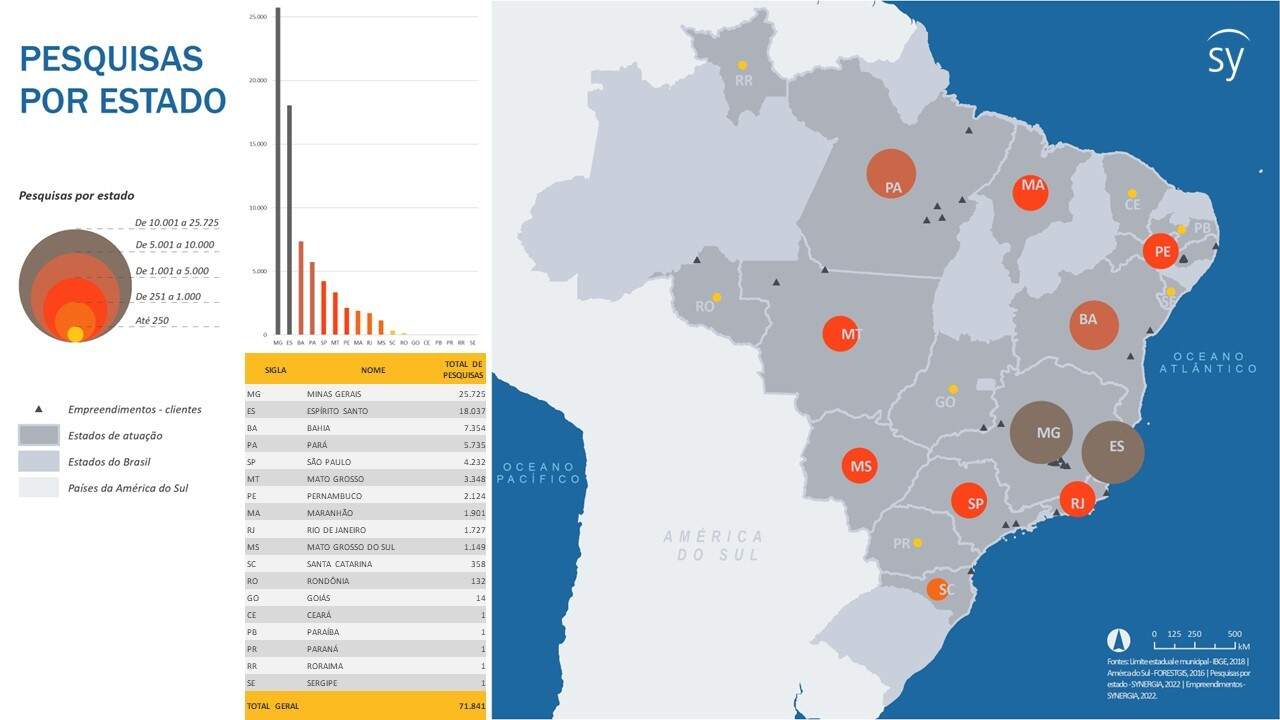 La memoria institucional de los conocimientos producidos en los territorios de Synergia está debidamente documentada en SIS pesquisa. Esta plataforma ha sido desarrollada por la consultora para aportar agilidad, control e inteligencia a los servicios socioambientales ofrecidos a los clientes, permitiendo la recogida, almacenamiento y correlación de datos en multiformato, con indexación territorial.  En 7 años, Synergia, a través de SIS, ha encuestado a más de 140 mil personas, destinatarias de proyectos socioambientales, en 477 municipios de 18 estados brasileños. Las decenas de miles de encuestas realizadas han abarcado una amplia gama de temas. Según la Figura 1, Minas Gerais, Espírito Santo, Bahia y Pará son los estados que concentran el mayor volumen de encuestas realizadas por Synergia desde 2014.